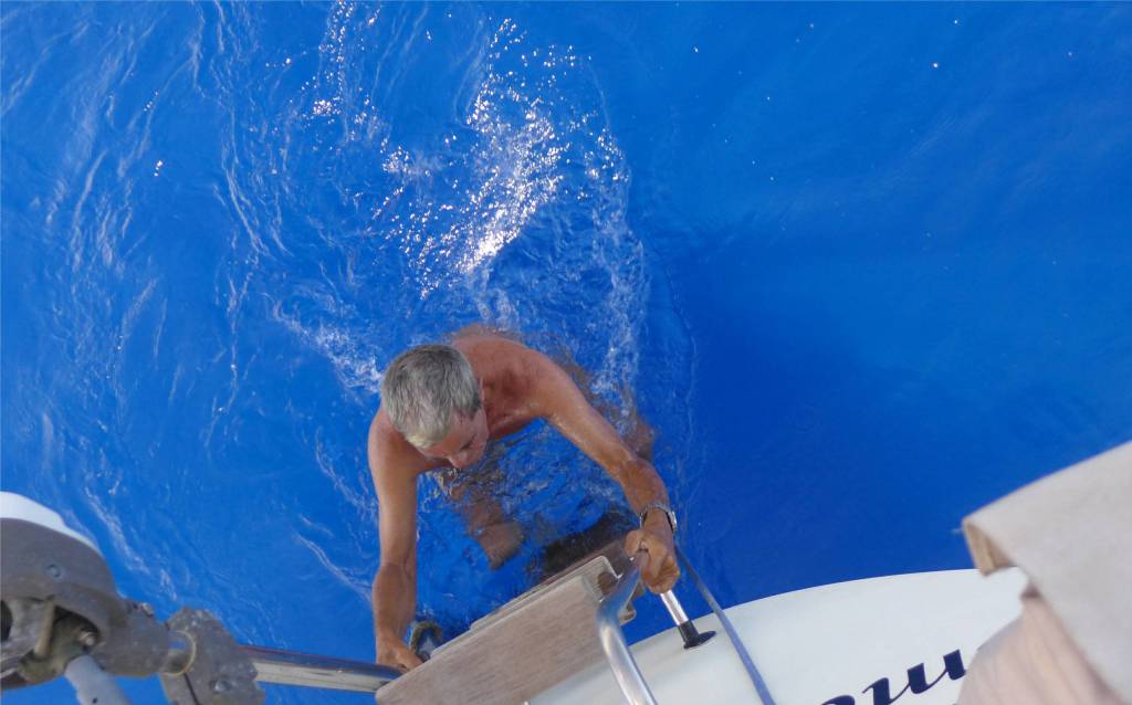 Es wird Zeit den Motor anzuschmeißen. Zwei Knoten Fahrt sind dann doch zu langsam. Wenn wir jetzt die Maschine starten, sind wir morgen früh in Mauritius. Aber vorher wollen wir baden. Wann hat man schon Gelegenheit mitten im Indischen Ozean ein Bad zu nehmen. Das Wasser ist hier 4000 Meter tief. Eigentlich ist die Wassertiefe völlig irrelevant, überall wo Mari schwimmt, kann ich nicht stehen, trotzdem ist es ein komisches Gefühl.