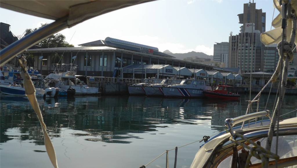 Inzwischen sind zwei weitere Yachten angekommen, eine möchte bei uns längsseits gehen. Das ist uns nicht so recht, das Hafenbecken ist unruhig und die andere Yacht viel schwerer und erheblich größer als wir. Es gibt keine andere Möglichkeit, also stimmen wir zu. Die Segler auf dem anderen Boot, haben nicht nur ihr Schiff gut im Griff, sie sind auch sehr nett und wir kommen ins Gespräch. Wir haben reichlich Zeit uns zu unterhalten, auch bei ihnen kommt der Zoll an Bord, obwohl sie nur in den Gewässern Mauritius unterwegs waren. Wir warten noch immer auf die Immigration. Ich laufe zur Coast Guard und frage, wann wir mit der Immigration rechnen können. Inzwischen ist Wind aufgekommen und es wird mühsam das Boot von der Betonwand abzuhalten. Schließlich kommt der Beamte von Immigration und stempelt unsere Pässe. Wir wären nun fertig, hätte der Zuständige nicht vergessen unser Zollpapier zu unterschreiben. Also warten wir weiter. Endlich bekommen wir den fehlenden Wisch und können ablegen. Der ganze Spaß hat über fünf Stunden gedauert, aber alle mit denen wir gesprochen haben waren außerordentlich nett.