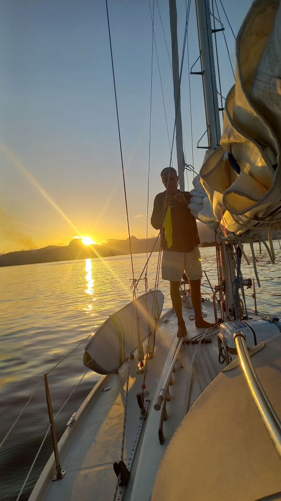 Am Dienstag (29.10.) erreichen wir in den frühen Morgenstunden den Windschatten Mauritius. „Sailing Yacht Marisol for Mauritius Coast Guard“ die Küstenwache ruft uns und fragt, wo wir hinwollen, wie viele Personen an Bord sind und warum wir Mauritius besuchen wollen. Als ich antworte „just for fun“ muss der Wachhabende lachen. Die Insel riecht süßlich, nach Zucker, nach Melasse. Ein interessanter Geruch. Spannend, dass „Land“ so unterschiedlich riecht, manchmal ganz grün nach Vegetation, manchmal nach Erde oder blumig und diesmal eben süß. Als die Sonne aufgeht treiben wir vor Port Louis, Mauritius Hauptstadt und dem einzigen „Port of Entry“. Der Morgen ist wunderschön. Die aufgehende Sonne zaubert ein goldenes Licht und die hohen Berge Mauritius zeichnen sich dunkel ab. Wir melden uns bei „Port Control“ und warten. Vor sechs Uhr darf niemand in den Hafen einlaufen. Mit uns gemeinsam kommen drei Tanker und einige Fischer an. Es herrscht ein reger Funkverkehr, die einen warten auf einen Platz im Hafen, die anderen wollen nur Proviant übernehmen oder Crews austauschen.